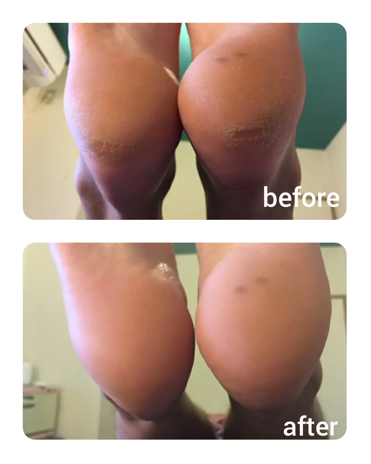 夏にコンフォートタイプのサンダルを素足で履いていたら角質がさらに厚くなったとのことでしたね。かかとへのソールの擦れと乾燥で拍車がかかったのだと思います。角質は除去しすぎてもまた、脳から「うすいぞ!守れ―!」の指令により厚く育ってしまいます。残すべき厚みは残すことで、ふんわりかかとが長持ちするよう仕上げております。日々の保湿をされるとさらに長持ちしますので、やってみてくださいね。気になってきたらひび割れる前にお待ちしております。
