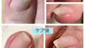 写真右上は、ケア前のほぼ真上から撮ったもの。爪が指の腹に沿って伸び切っているため、上からの見た目では気がつかなかったのかも知れません。ご高齢になり視力も落ちてくると手探りで爪切りをされていることも多いため、気づいた時には曲がって伸びていて、爪切りが当てにくくなったまま時間が経ってしまったのかも知れません。