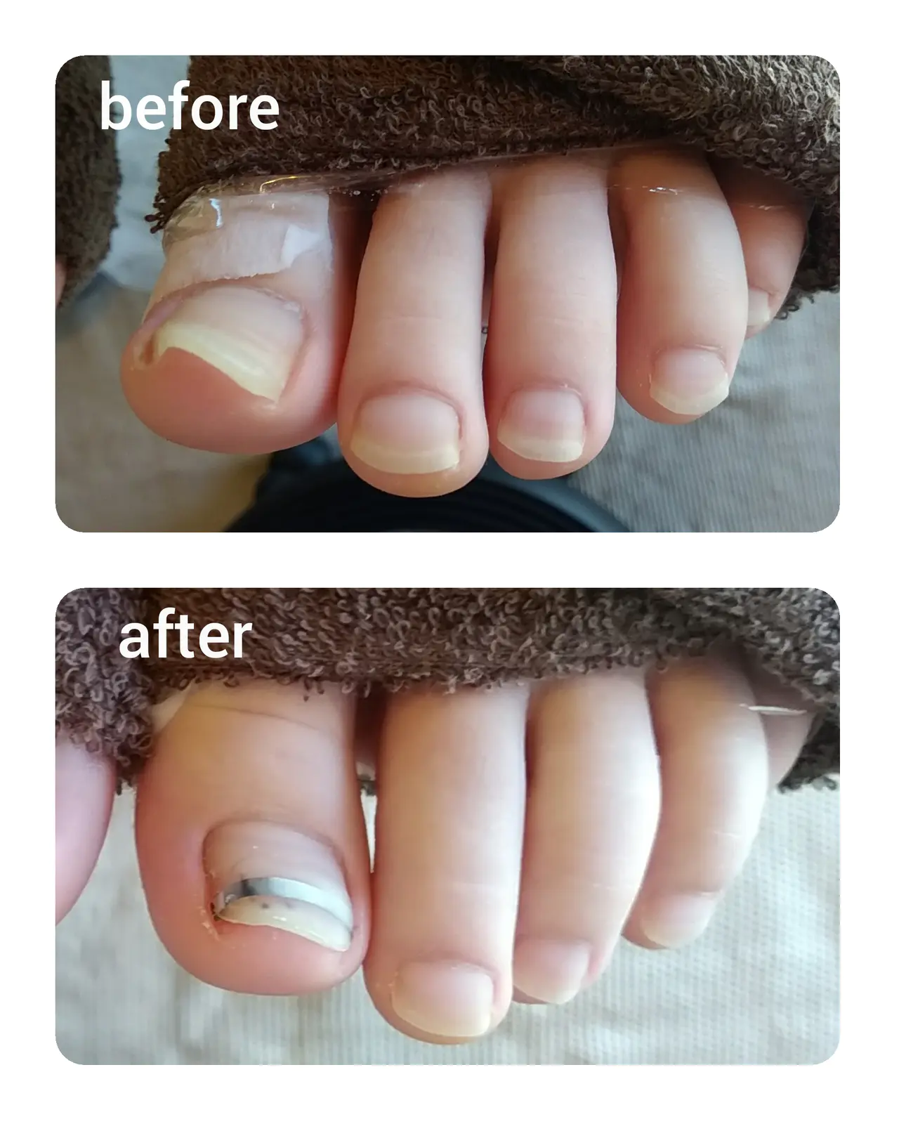 長い間、左足親指の巻き爪の痛みに悩んでいました。通販で何種類も巻き爪ケアグッズを購入しました。ある矯正器具を付けた時には爪の成長を妨げたのか、爪が前に伸びず厚く盛り上がってきてしまったので、相談に伺いました。