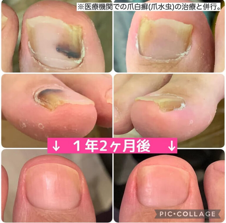 同時に爪の形を整えるサロンケアもスタートし、1年2ヶ月後には食い込みのないきれいな爪に戻りました。それから4年、定期的な爪切りケアにお越しくださっていて、今も巻き爪の様子はありません。