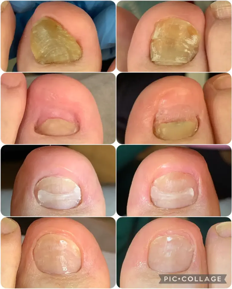 50代、女性。初回ご来店から10ヶ月間の経過写真。最下段はいちばん最近の5回目ご来店のケア後です。まだ経過途中ですが、綺麗な爪が育ってきました。