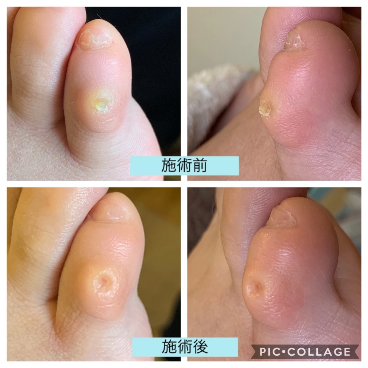 くり返す魚の目が育ってきて靴に当たり、痛みが強くなってきたお客さま。角質トラブルケアで魚の目の芯を取り除き、痛みはなくなりました。